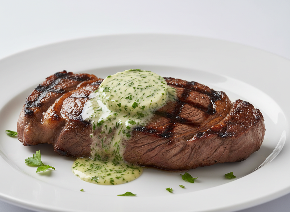 Perfectly seared ribeye steak topped with garlic herb butter.